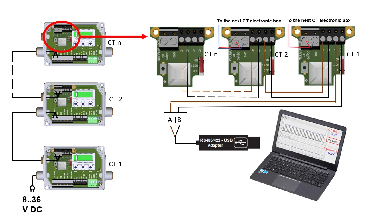 Modbus RTU 인터페이스는 CT, CTlaser, CTratio 파이로미터에 사용되는 유연한 통신 표준으로, 산업 환경에서의 적외선 온도 모니터링에 적합합니다. A, B 두 가닥을 사용하는 차동 신호 전송으로 우수한 노이즈 내성을 제공하며, 최대 1,200 m 거리까지 안정적인 통신이 가능합니다하나의 Modbus RTU 버스에 최대 32대의 파이로미터를 연결할 수 있어 네트워크 기반 온도 모니터링에 이상적입니다. 일반적으로 9,600 또는 19,200 bps의 전송 속도를 지원하며, 마지막 적외선 센서에 120Ω 종단 저항을 적용하면 신호 반사를 방지하여 안정적인 데이터 전송을 보장합니다정밀하고 효율적인 적외선 온도 데이터 수집이 필요한 다양한 산업용 애플리케이션에서 이상적인 솔루션입니다.