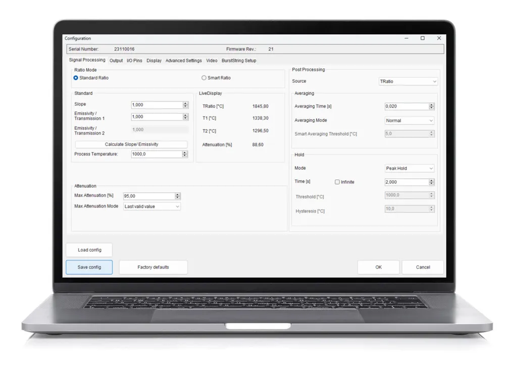 CompactPlus Connect 소프트웨어는 파이로미터의 파라미터 설정을 포함한 구성 설정을 저장하고 복원할 수 있도록 지원합니다. 이를 통해 특정 애플리케이션에 맞춰 사전에 정의된 설정을 불러와 빠르게 시스템을 구성할 수 있습니다.