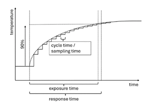 The response time is strongly dependent on the detector technology used, particularly its time constant and whether the input pulse electronic signal processing of the measuring device is synchronized or not. With unsynchronized signal acquisition, this value can fluctuate by one cycle time (with pyrometers) or one image period (with infrared cameras), which can be relevant when recording fast events. The larger value must be specified in the device specifications. The response time must be distinguished from the exposure time, as the latter does not take the entire processing chain into account.
