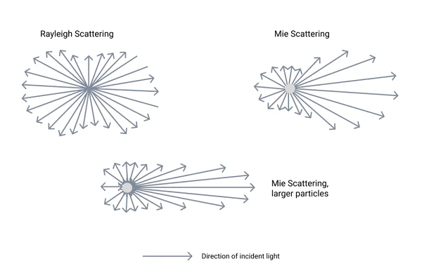 For slightly larger particles (r < λ), Mie scattering is generated, which has a more forward-directed scattering. This applies to aerosols such as dust or pollution in the atmosphere. This scattering is more dependent on the wavelength of the scattered light and tends to scatter it more evenly. For particles whose size is larger than the wavelength, the scattering is more geometric. Geometric volume scattering is often referred to as optical scattering if it is related to the optical path within the optical system. When passing through bulk material such as optical windows or lenses, the light is scattered by inhomogeneities in the lens material or unwanted material defects such as impurities. During the interaction, most of the light is scattered in the forward direction, but a certain amount is scattered in the opposite direction.